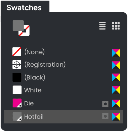 Colour all vector elements to be further processed with the corresponding spot colour from the Window > Colour Fields control panel. To do this, select the different elements in Adobe Illustrator with the selection tool in the Tools panel and colour, for example, with the spot colour field “Foil”.