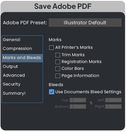 bleed of 2.5 mm all around should appear automatically. Finally, click the Save PDF button. Your print-ready PDF file is now saved in the folder you selected earlier.